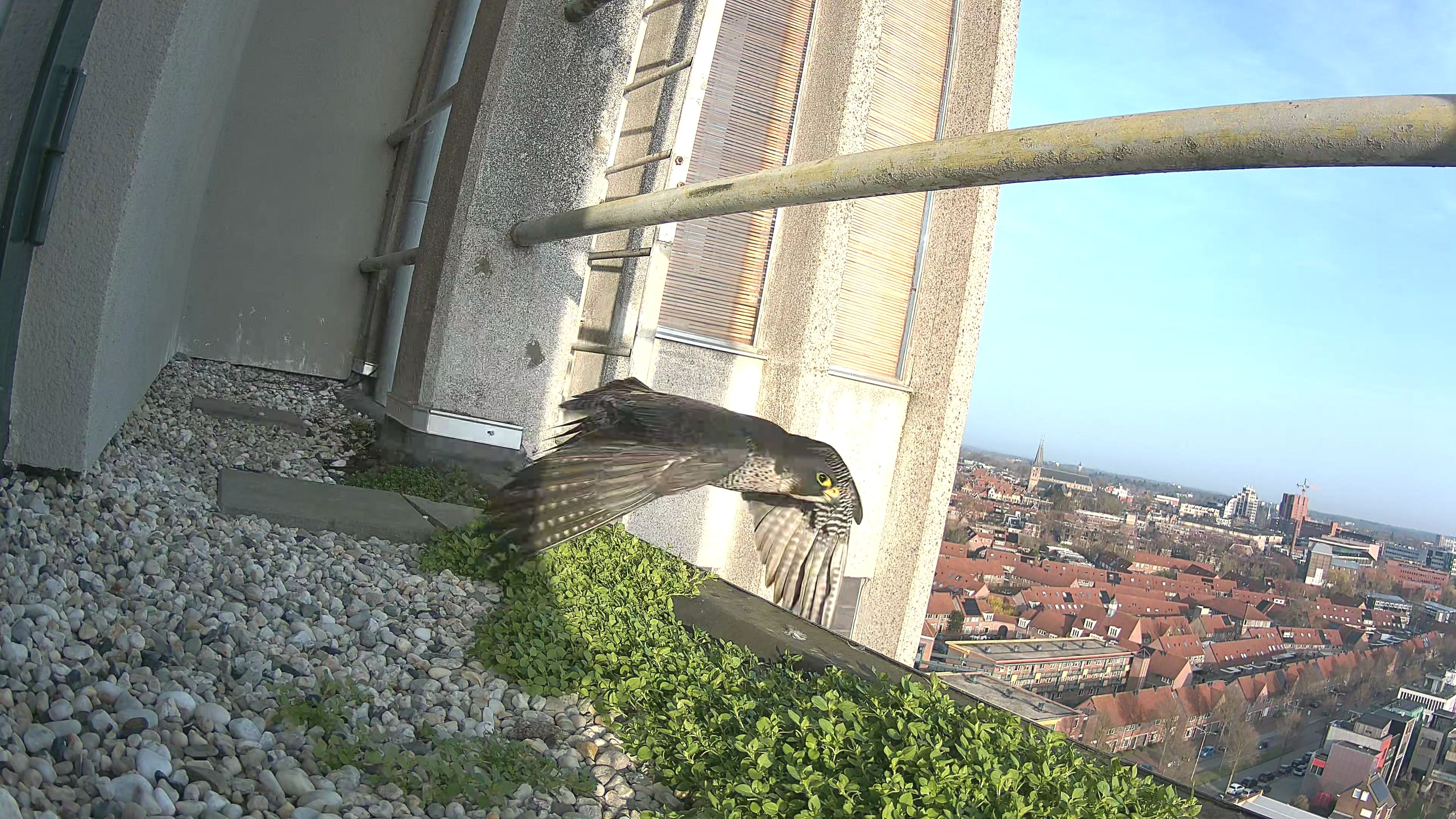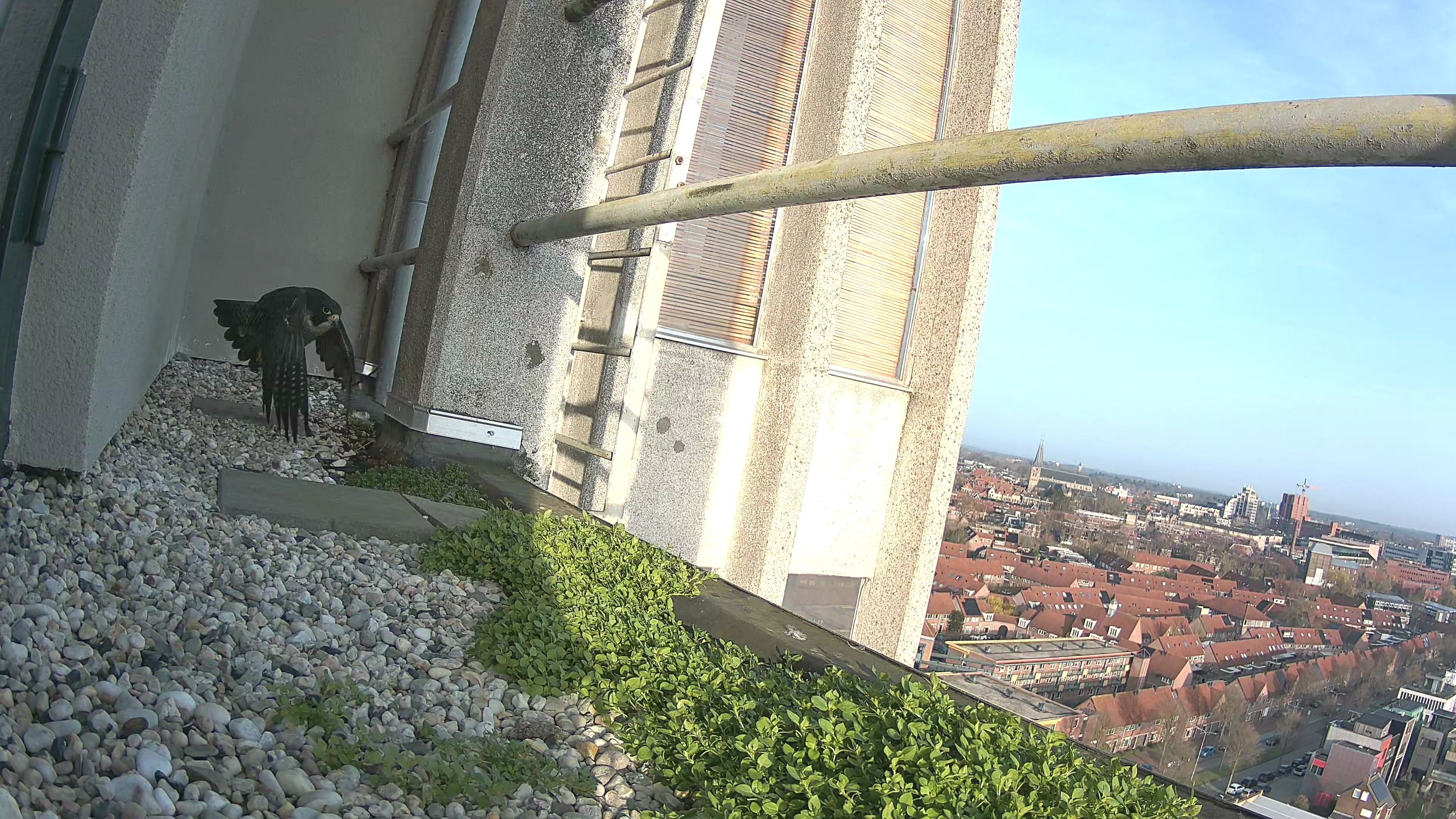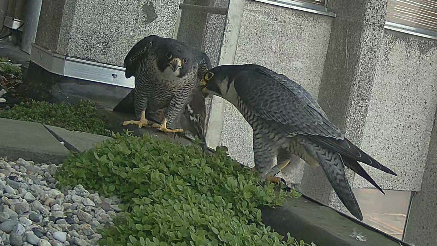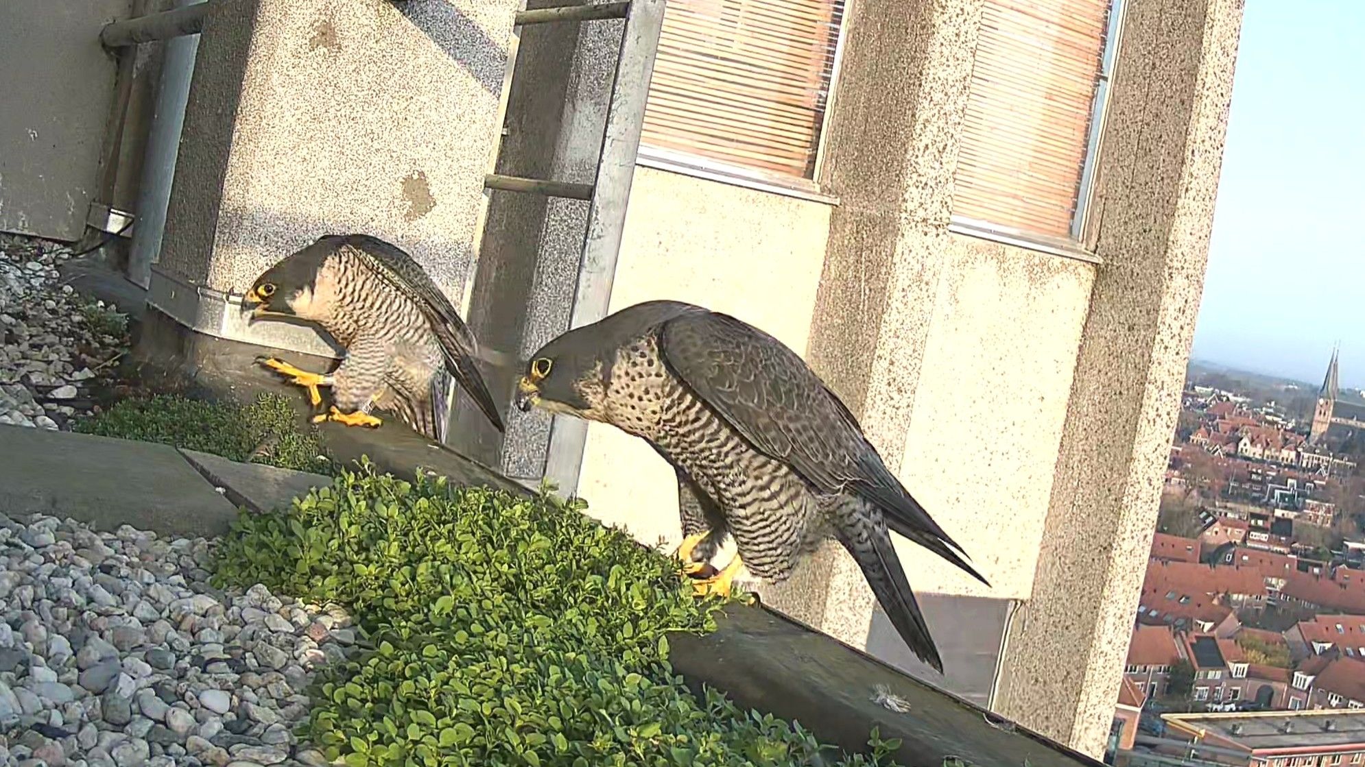 Het duo heeft hun favoriete plek weer gevonden: het zijbalkon aan de noordzijde, op de balkon aan de kant van de haven. Dit is dezelfde nestlocatie als voorgaande jaren — de nestkast op het hoogste dak staat er helaas voor niets.
